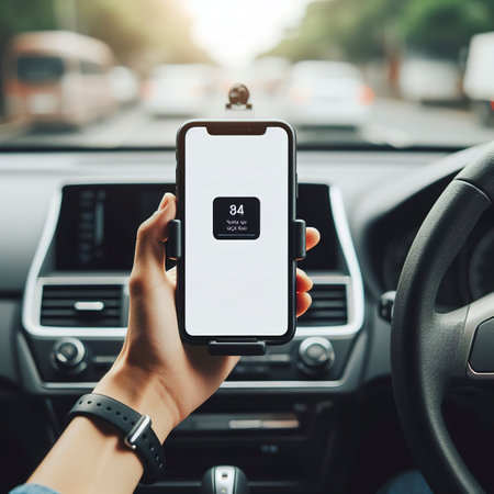 selective focus of smartphone device gadget with white screen mounted on phone holder in car for gps navigator, mock-up