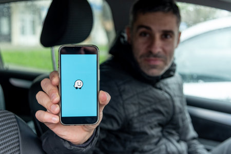 Bar, Montenegro, 12 January 2026, Smartphone navigator Waze Maps app for driver