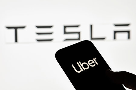 Tashkent, Uzbekistan - 29 October, 2021: A person holds smartphone with Uber trademark with Tesla background. Uber strikes deal with Tesla to boost electric car uptake