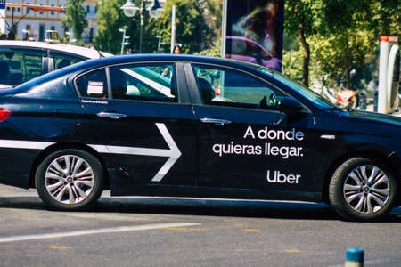 Seville Spain September 04, 2021 Taxi driving through the streets of Seville during the coronavirus outbreak hitting Spain, wearing a mask is mandatory