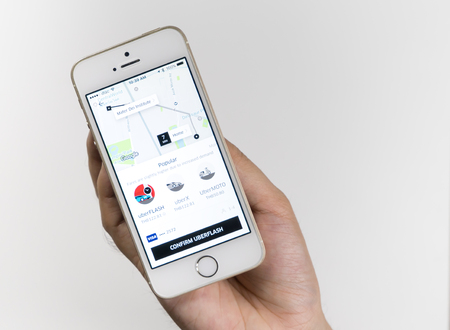 CHIANG MAI,THAILAND - JUL 7,2016 : A MAN hand holding Uber app showing on iphone 6s. Uber is smartphone app-based transportation network