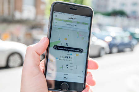 WARSAW. POLAND - June 2016: UBER mobile app on mobile phone. Mobile phone in the mans hand. Calling a taxi using the application.