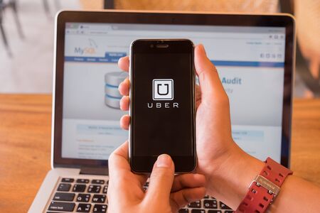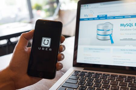 CHIANG MAI,THAILAND - Aug 4,2016 : A MAN hand holding Uber app showing on iphone 6s or 6s Plus background Mysql in laptop. Uber is smartphone app-based transportation network