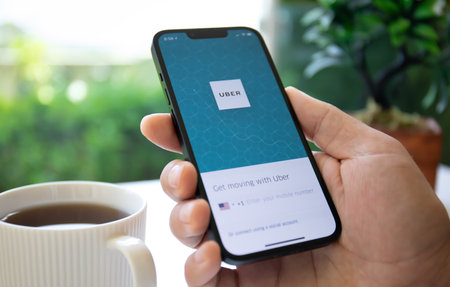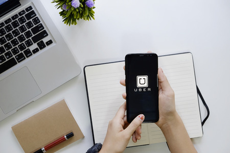 Bangkok, Thailand - September 28, 2017: Business Man is using Uber application on his iPhone.