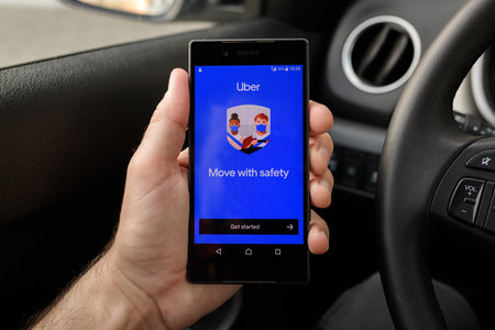 Wroclaw, Poland - AUG 25, 2020: Uber driver holding smartphone in car. Uber is sharing-economy service for clothed transport.