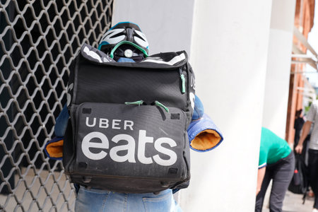 Los Angeles, California, USA - 21 November 2019: Uber Eats logo on phone screen with icon on laptop on blurry background, Illustrative Editorial.