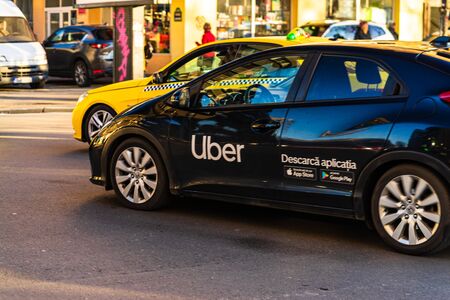 Uber car in traffic, modern city taxi service in Bucharest, Romania, 2019