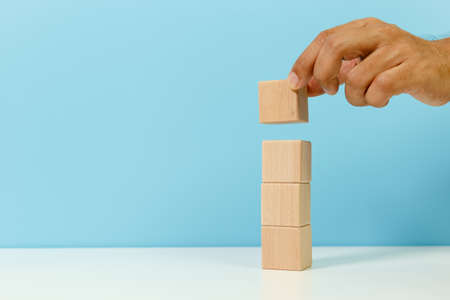 Hand piling up and stacking a wooden block in tower. Business concept for growth success process.
