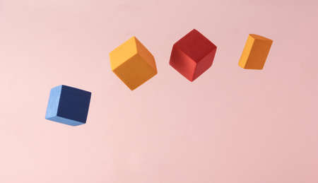 Flying cubes in various colors on a pink background. 3d render