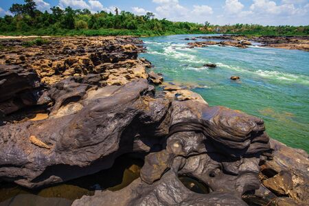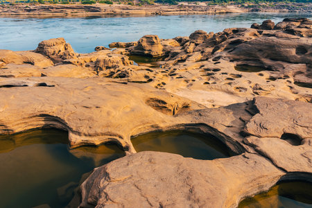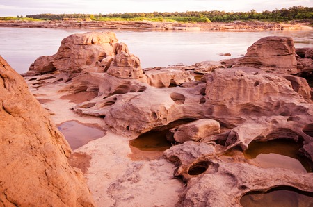 The canyon of asian, rock sculpture by water, wind for million years at Khong river called Chom Dow beach, Ubon Ratchathani, Thailand