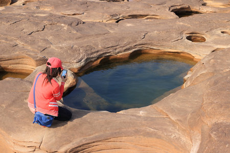 Female tourist take a photo with smartphone at Grand Canyon in Thailand, Nature of rock canyon in Mekong River, Dry rock reef with mountain hills. View of Sam Phan Bok is called Valley of Thailand.