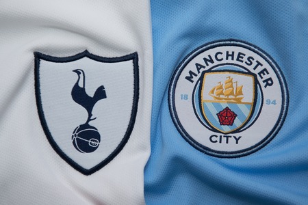 BANGKOK, THAILAND - AUGUST 5: The Logo of Tottenham Hotspur and Manchester City on Football Jerseys on August 5 ,2017 in Bangkok Thailand.