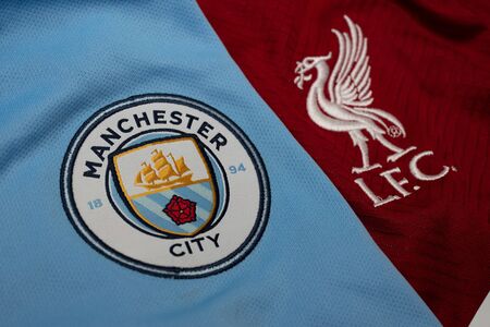BANGKOK, THAILAND - DECEMBER 30, 2018: The Logo of Manchester City and Liverpool on the Jerseys on December 30, 2018. Both of them will face each other on EPL this weekend