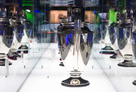 BARCELONA - SEPTEMBER 22, 2014: UEFA Champions League Cup in museum. UEFA Cup - trophy awarded annually by UEFA to the football club that wins the UEFA Champions League. Camp Nou, Barcelona, Spain.