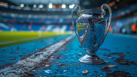 June 14, 2021 Munich, Germany. The emblem of the FC Bayern Munich football club and the UEFA Champions League Cup against the backdrop of a modern stadium.