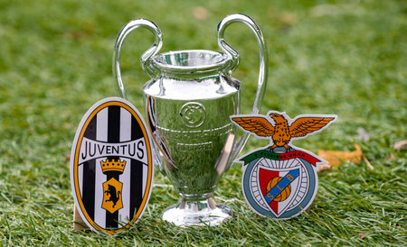 September 3, 2022, Moscow, Russia. Emblems of football clubs participating in the group stage of the UEFA Champions League SL Benfica Lisbon and Juventus FC Turin.