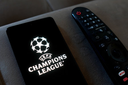 May 6, 2024, Brazil. In this photo illustration, the logo of the UEFA Champions League seen displayed on a smartphone next to a TV remote control.