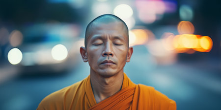 Serene Monk Meditating Peacefully in a Busy City Street at Dusk.