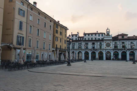 Typical italian buildings and tables of street restaurants on Piazza del Mercato Market square in Brescia city historical center, evening twilight view, Italian street, Lombardy, Northern Italy