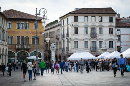 Bassano del Grappa, Vicenza, Italy - October 20, 2019: People stroll in one of the main squares. Tourists and residents alike take advantage of the beautiful day to experience the city center