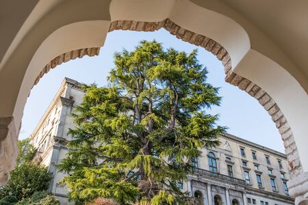 Brescia, Italy - August 1 2018: the view from arches of Comune di Brescia on Piazza della Loggia, Brescia on August 1 2018, Lombardy, Italy.