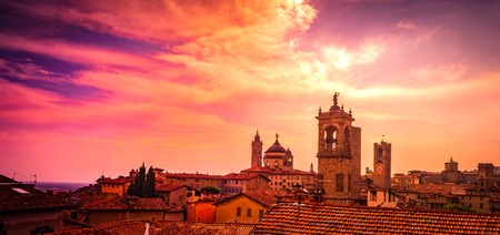 The city of Bergamo is composed of an old walled core, known as Città Alta (Upper Town), nestled within a system of hills, and the modern expansion in the plains below at sunset