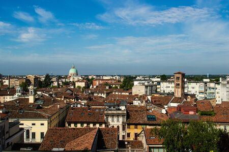 Panoramic view from above with a dome and roofs of the city of Udine, Italy close up