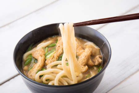 kitsune udon Japanese noodles with fried tofu isolated on wooden table
