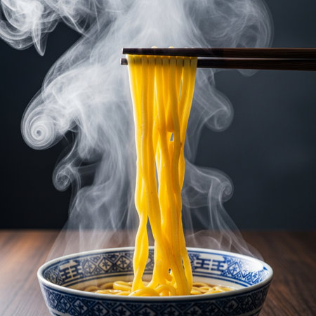 A close-up of steaming noodles served in a cozy restaurant showcasing culinary delight and warmth.