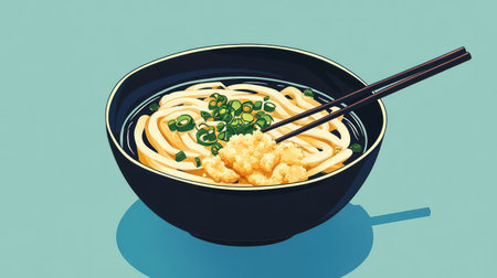 This visually appealing image features a bowl of delicious noodles topped with fresh green onion and crispy tempura, served with chopsticks.