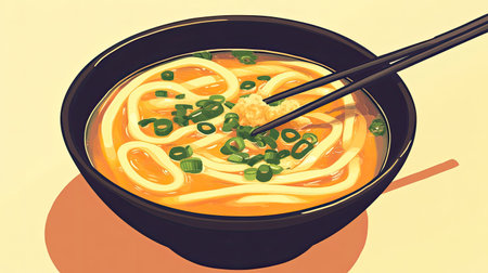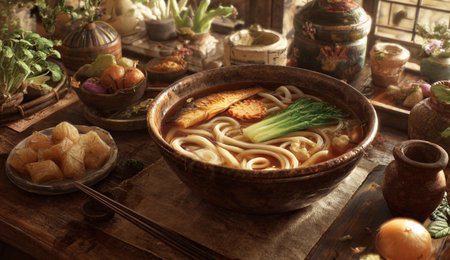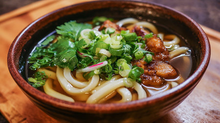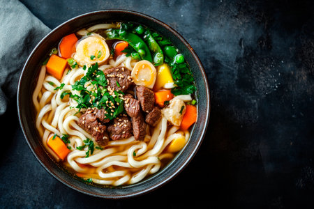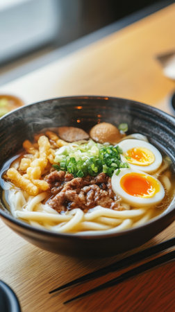 Japanese Udon Noodle Soup with Toppings. Generative AI