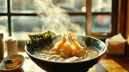 This enticing image showcases a bowl of soba noodles topped with crispy shrimp tempura and fresh garnishes, all enveloped in steam, evoking warmth and deliciousness.