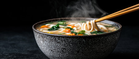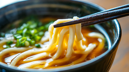 Chopsticks lifting a serving of udon noodles from a bowl, with steam and a rich, flavorful broth in the background. --chaos