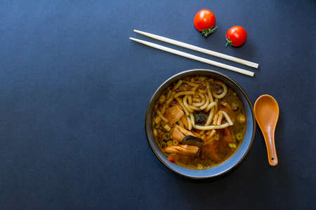 The udon noodles in a bowl on black slate table. Traditional Japanese dish. Top view.