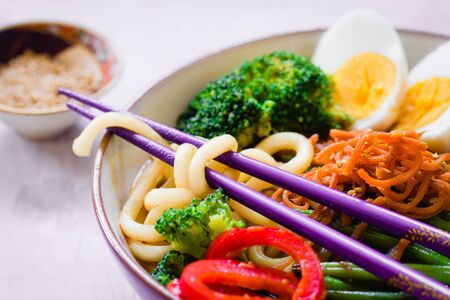 Ramen or udon noodles with vegetables and eggs