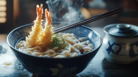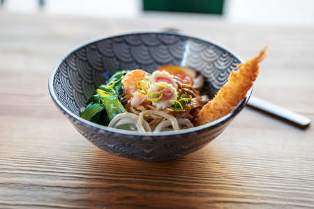 udon ramen noodles with shrimps tempura - Japanese food style