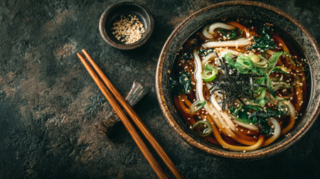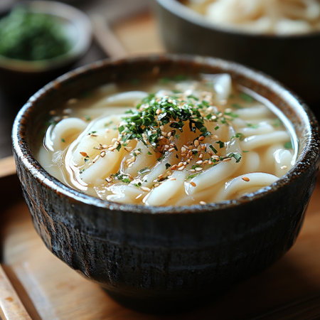 Warm udon noodles in broth, topped with sesame seeds, create a cozy vibe.