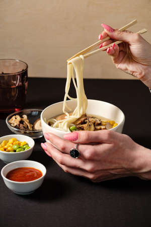 Cropped shot view of woman holding chopsticks before eating Udon. Udon is a thick, white, ribbon-like noodle popular in Japanese cuisine.