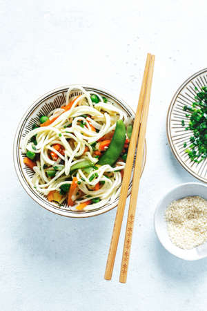 Asian noodles with vegetables and sesame served in bowl.