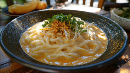 japanese udon noodles in a bowl on a wooden table