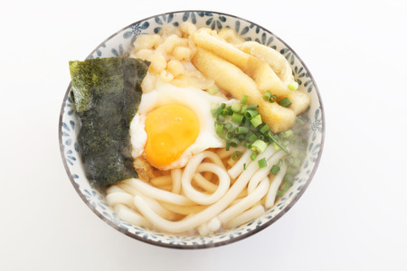 Japanese Ingredients. Warm udon noodles with egg and chopped green onion