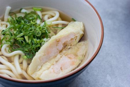 Shrimp udon soup with green onions and spices served in a traditional bowl