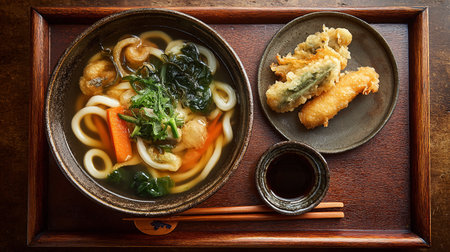 Discover a steaming bowl of soba noodles topped with fresh green onions, paired with crispy tempura, all displayed in a charming Japanese dining atmosphere.