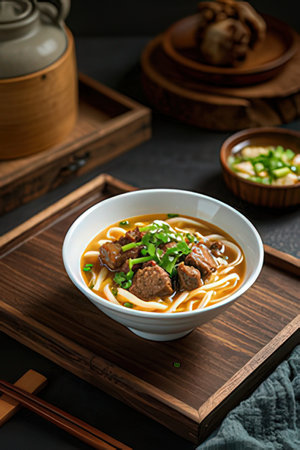 Beef and scalion noodles on a wooden tray