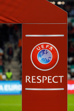Minsk, Belarus - October 13, 2019 : UEFA European Qualifiers 2020. Official UEFA Respect logo before the game between Netherlands and Belarus