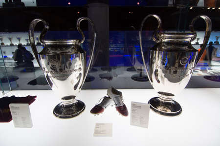 Barcelona, Spain - September 22, 2014: UEFA Champions League Cup in museum. UEFA Cup - trophy awarded annually by UEFA to the football club that wins the UEFA Champions League. Camp Nou, Barcelona.