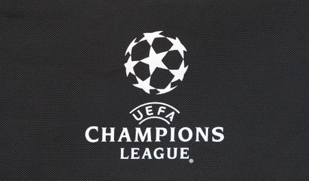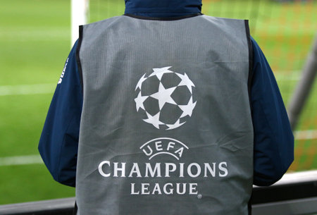 KHARKIV, UKRAINE - FEBRUARY 21, 2018: UEFA Champions League logo on the ballboy's bib during UEFA Champions League Round of 16 game Shakhtar Donetsk v AS Roma at OSK Metalist stadium in Kharkiv