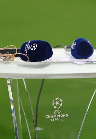 KHARKIV, UKRAINE - FEBRUARY 21, 2018: Microphones with UEFA Champions League logo on the TV presenter's desk seen at Metalist stadium during UEFA Champions League Round of 16 game Shakhtar v Roma
