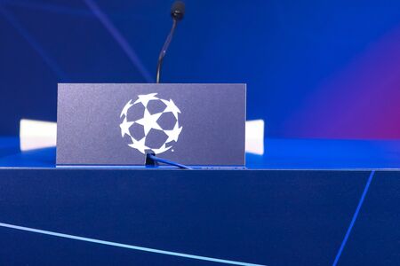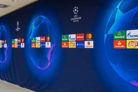 Zagreb, Croatia - December 11, 2019 : UEFA Champions League sign on the press conference after the game finished with score of 1:4 for Manchester City, Dinamo Zagreb vs Manchester City.
