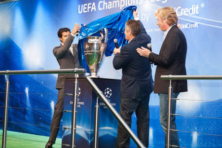 KIEV,UKRAINE SEPTEMBER 30 :UEFA Champions League Trophy Tour 2011 in Kiev, Ukraine September 30,2011. Ambassadors UEFA Aleksey Mihaylichenko, Luis Figo, Davor Suker present Champions League Cup